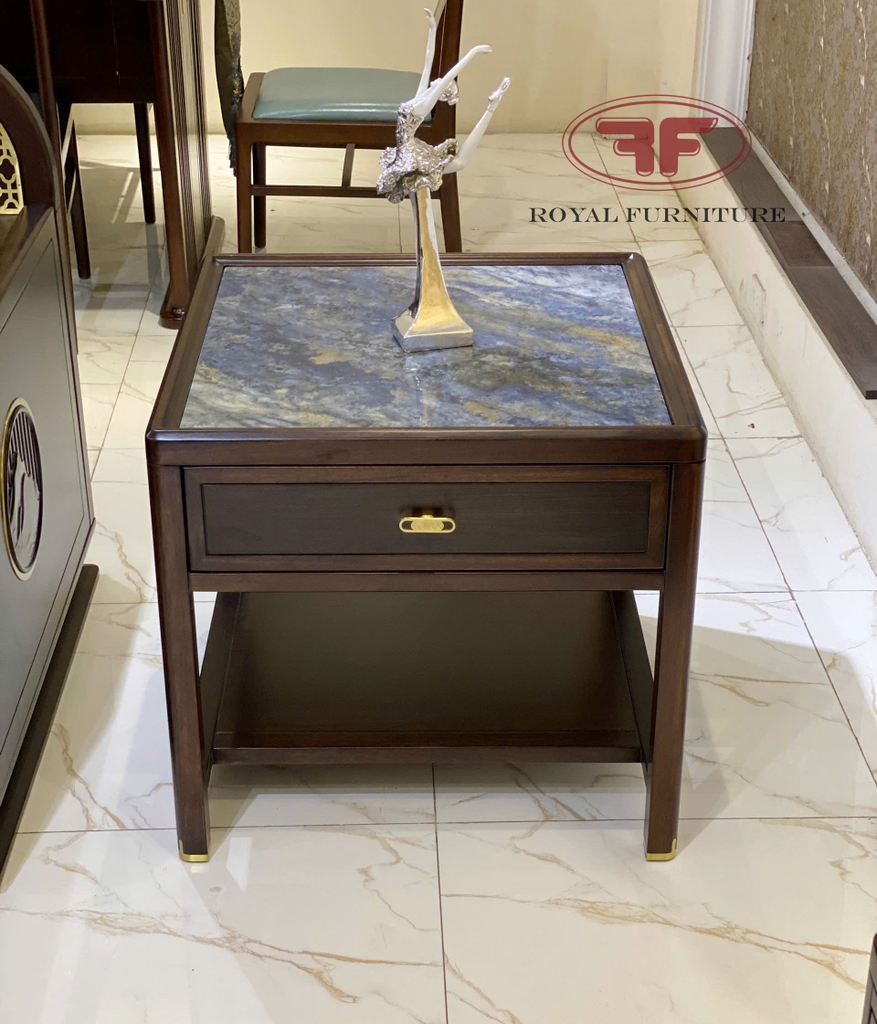 Bàn góc Indochine gỗ óc chó mặt đá có ngăn kéo nhập khẩu HT2312
