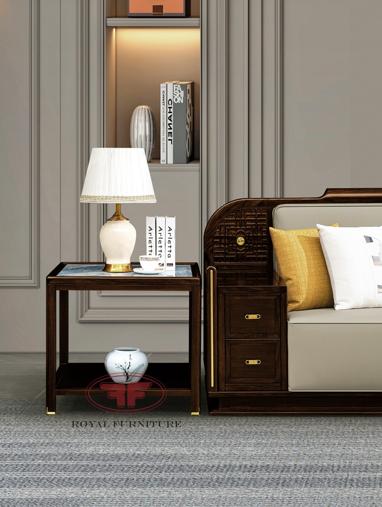 Mẫu bàn góc mặt đá Indochine Gỗ óc chó này được thiết kế hình vuông, phía dưới thiết kế thêm 1 kệ để đồ, để tạo điểm nhấn, phần chân của bàn góc mặt đá Indochine Gỗ óc chó 2315 được bọc đồng nguyên khối tạo điểm nhấn và thể hiện sự sang trọng. Ngoài ra, tại Showroom còn trưng bày nhiều mẫu nội thất indochine để Quý khách hàng tham quan và lựa chọn.
