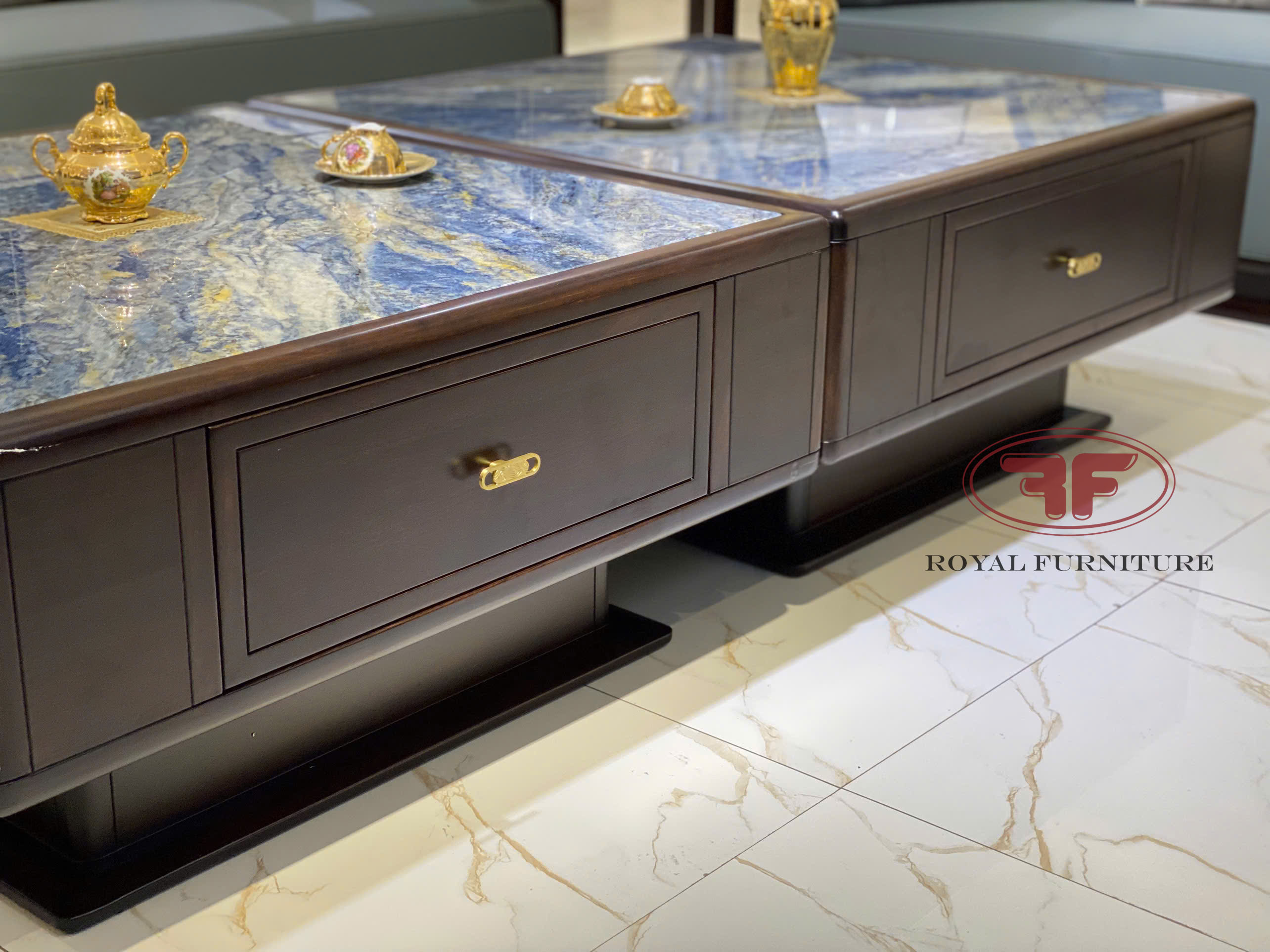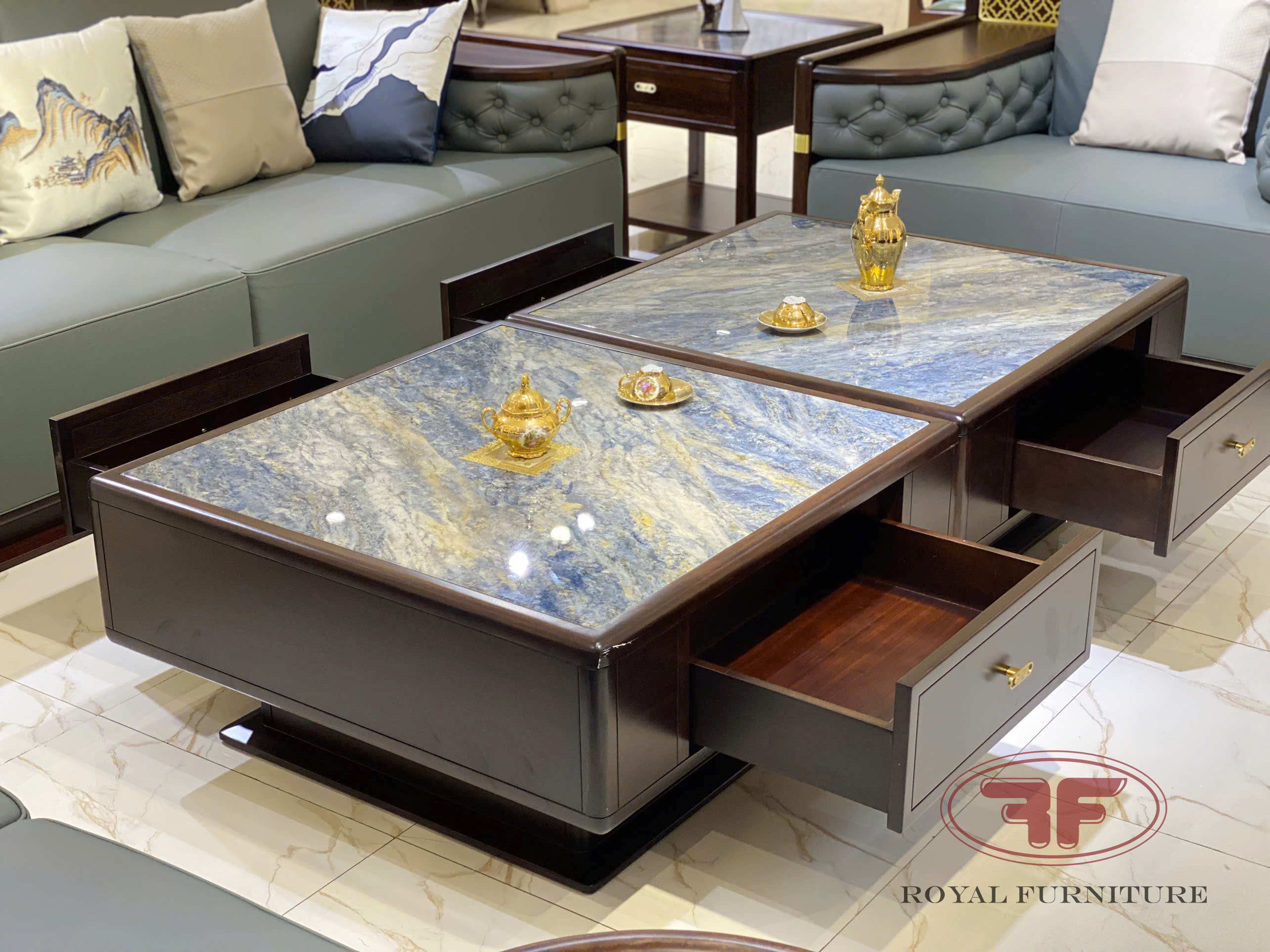 Tiếp tục là sự kết hợp bàn trà đáng để trải nghiệm cho không gian phòng khách indochine mà Quý khách có thể tham khảo. Sự kết hợp linh hoạt mà Nội thát Tân Hoàng Gia muốn giới thiệu đến bạn là mẫu bàn trà Indochine Gỗ óc chó 1m8 mặt đá 2310. Nhìn ảnh bàn trà bạn sẽ dễ dàng nhận thấy bàn được ghép từ 2 bàn vuông có kích thước 0.9m, mỗi bàn vuông được tích hợp 1 ngăn kéo rộng.