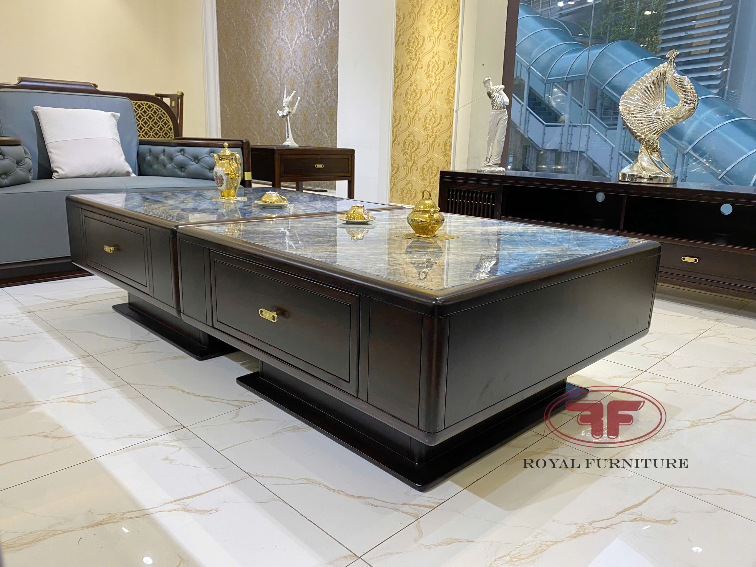 Tiếp tục là sự kết hợp bàn trà đáng để trải nghiệm cho không gian phòng khách indochine mà Quý khách có thể tham khảo. Sự kết hợp linh hoạt mà Nội thát Tân Hoàng Gia muốn giới thiệu đến bạn là mẫu bàn trà Indochine gỗ óc chó 1m8 mặt đá 2310. Nhìn ảnh bàn trà bạn sẽ dễ dàng nhận thấy bàn được ghép từ 2 bàn vuông có kích thước 0.9m, mỗi bàn vuông được tích hợp 1 ngăn kéo rộng.