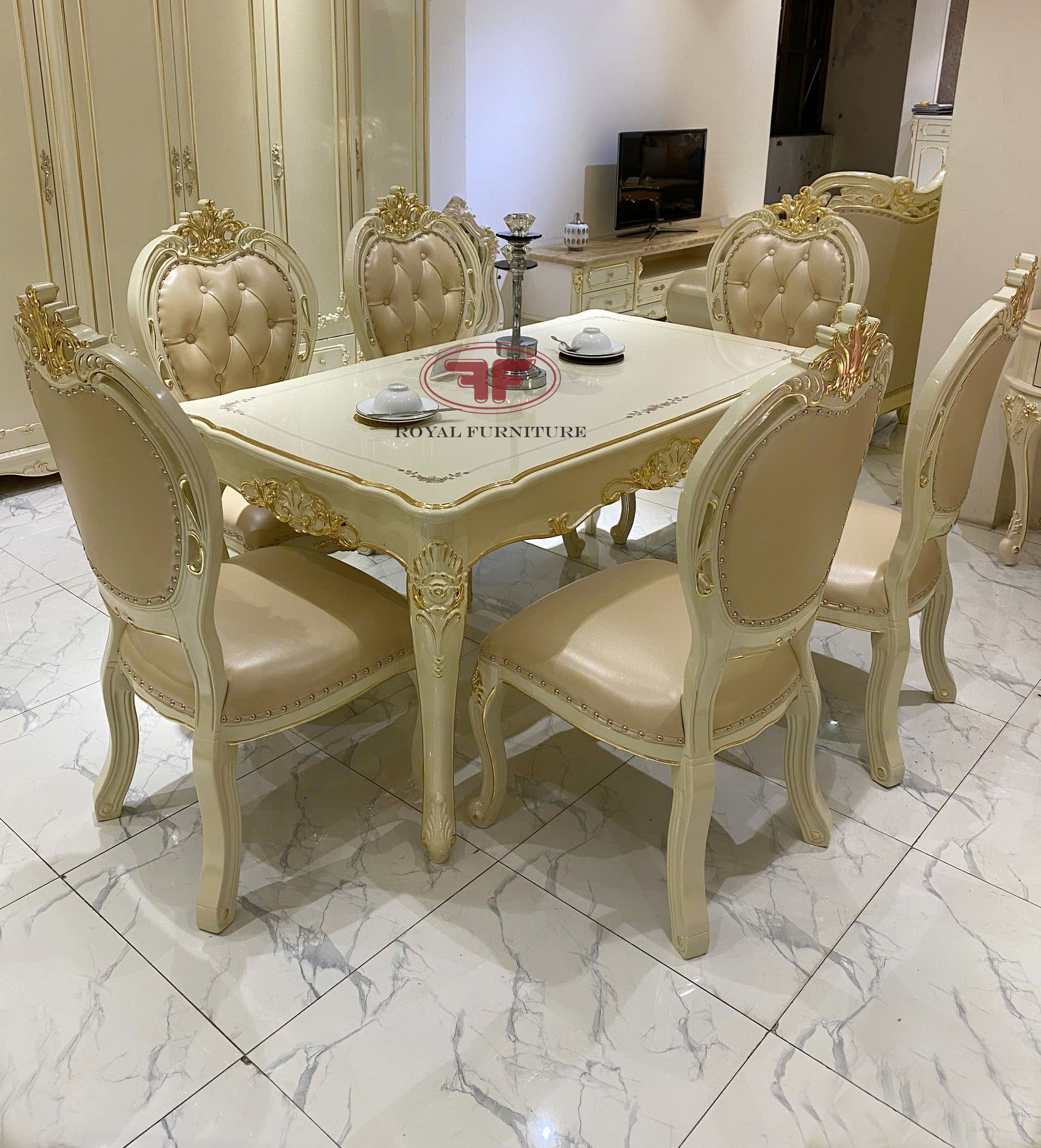 Nếu là 1 tín đồ đam mê nội thất , đặc biệt là các món đồ nội thất tân cổ điển thì chắc chắn khách hàng sẽ biết ngay đến Bộ bàn ăn 6 ghế tân cổ điển dát vàng nhập khẩu 933B - mẫu bàn ăn " best - seller " luôn dẫn đầu về doanh số bán chạy tại Nội Thất Tân Hoàng Gia .