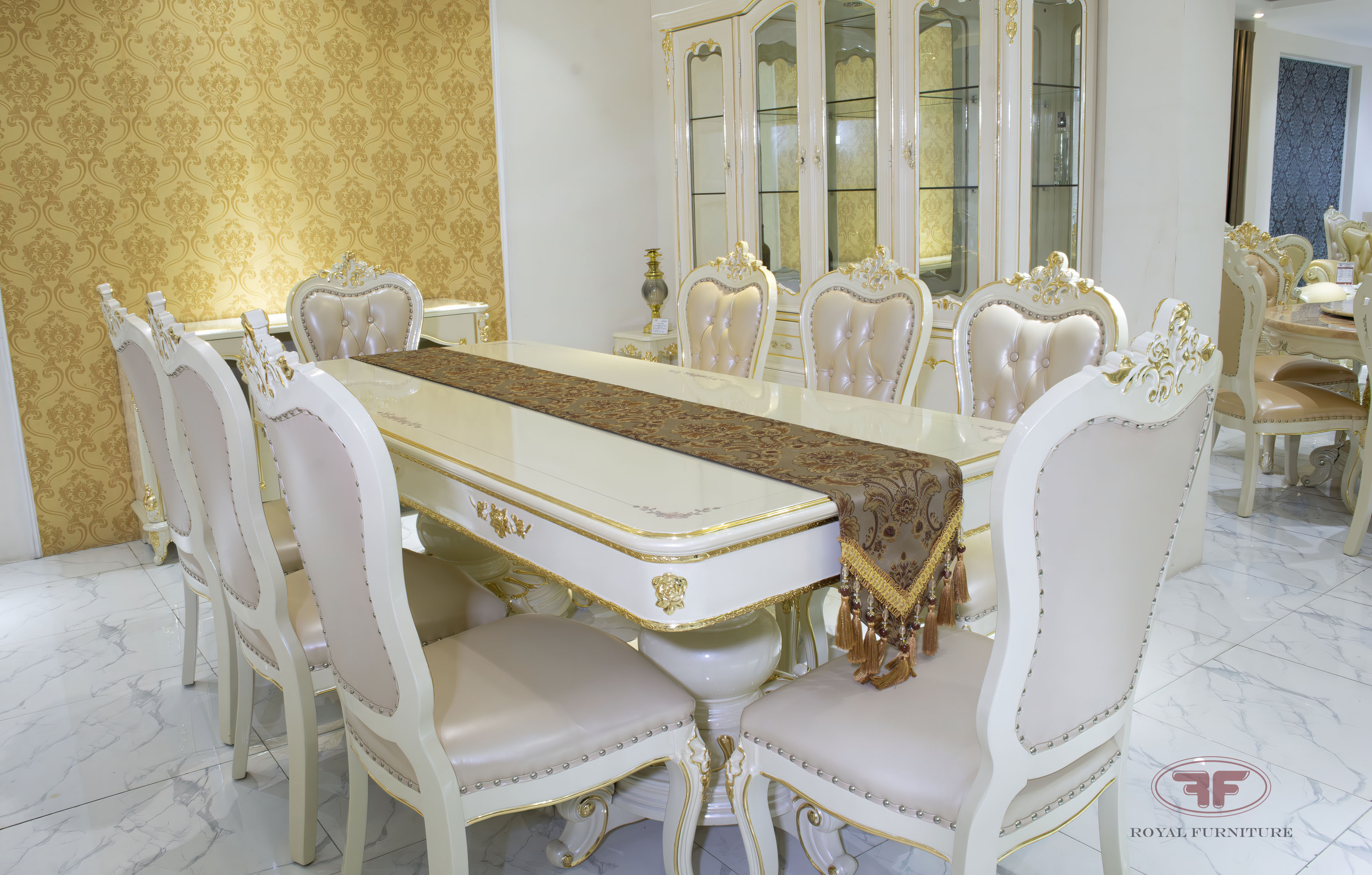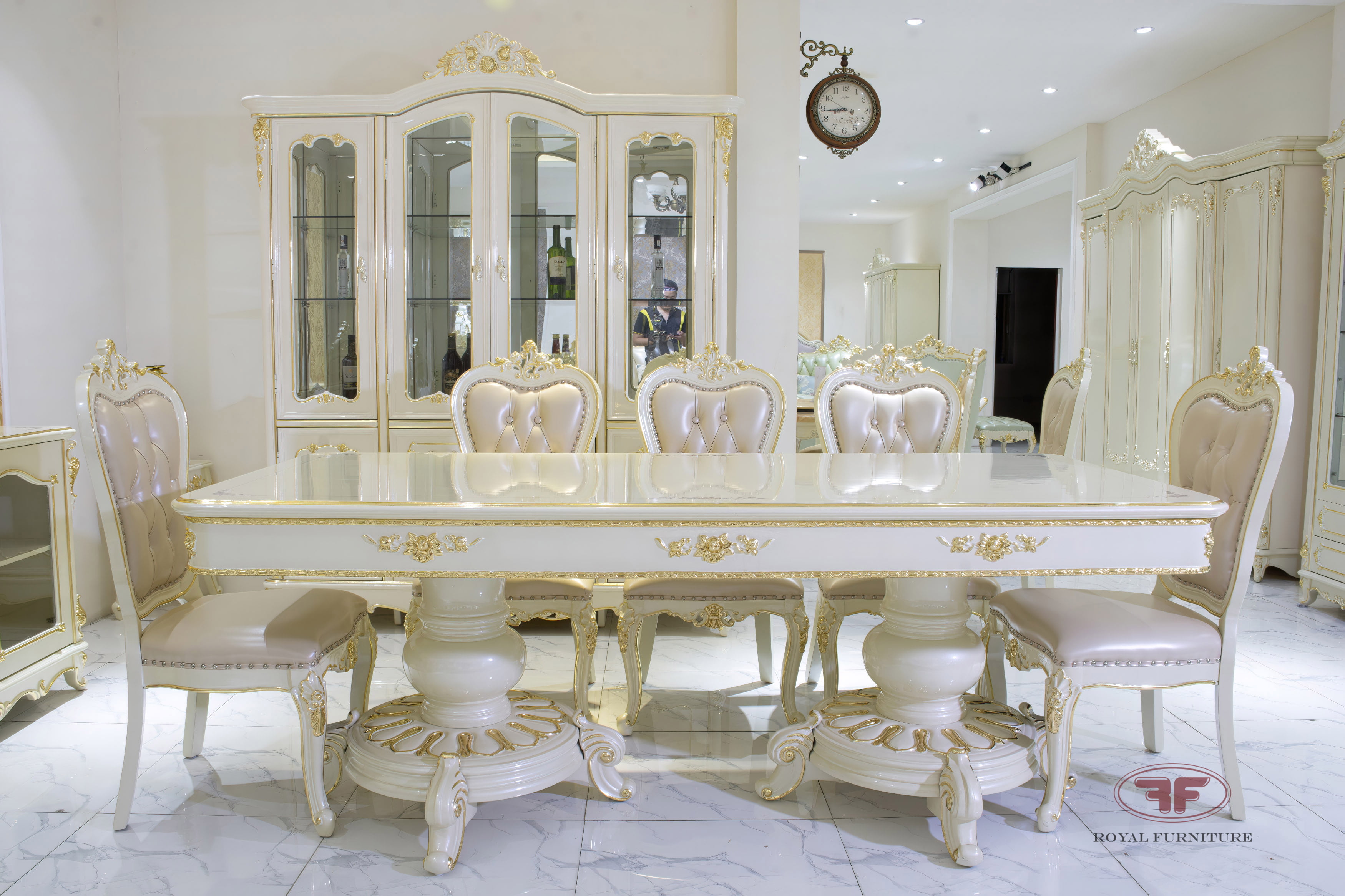 Bộ bàn ăn 8 ghế tân cổ điển dát vàng 939B gồm: 01 bàn ăn gỗ 2m2 dát vàng + 8 ghế dát vàng: