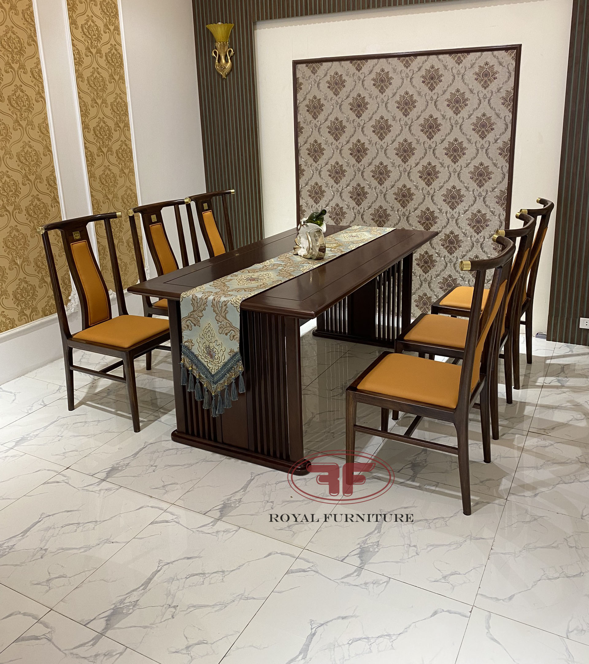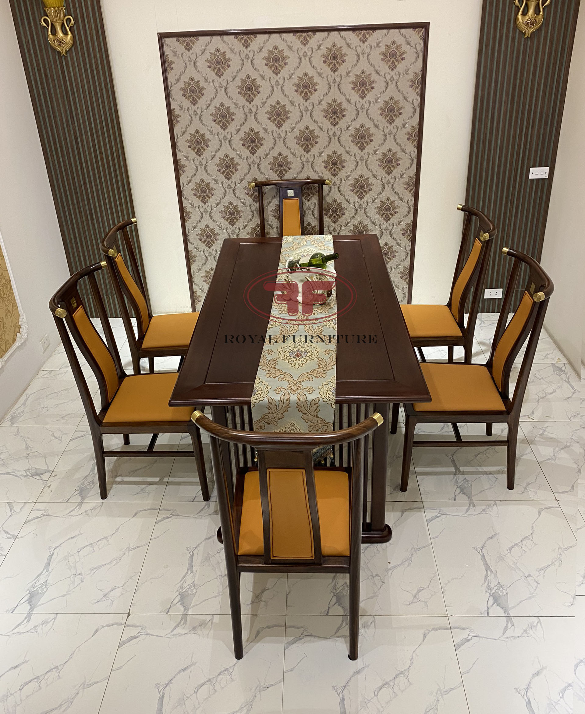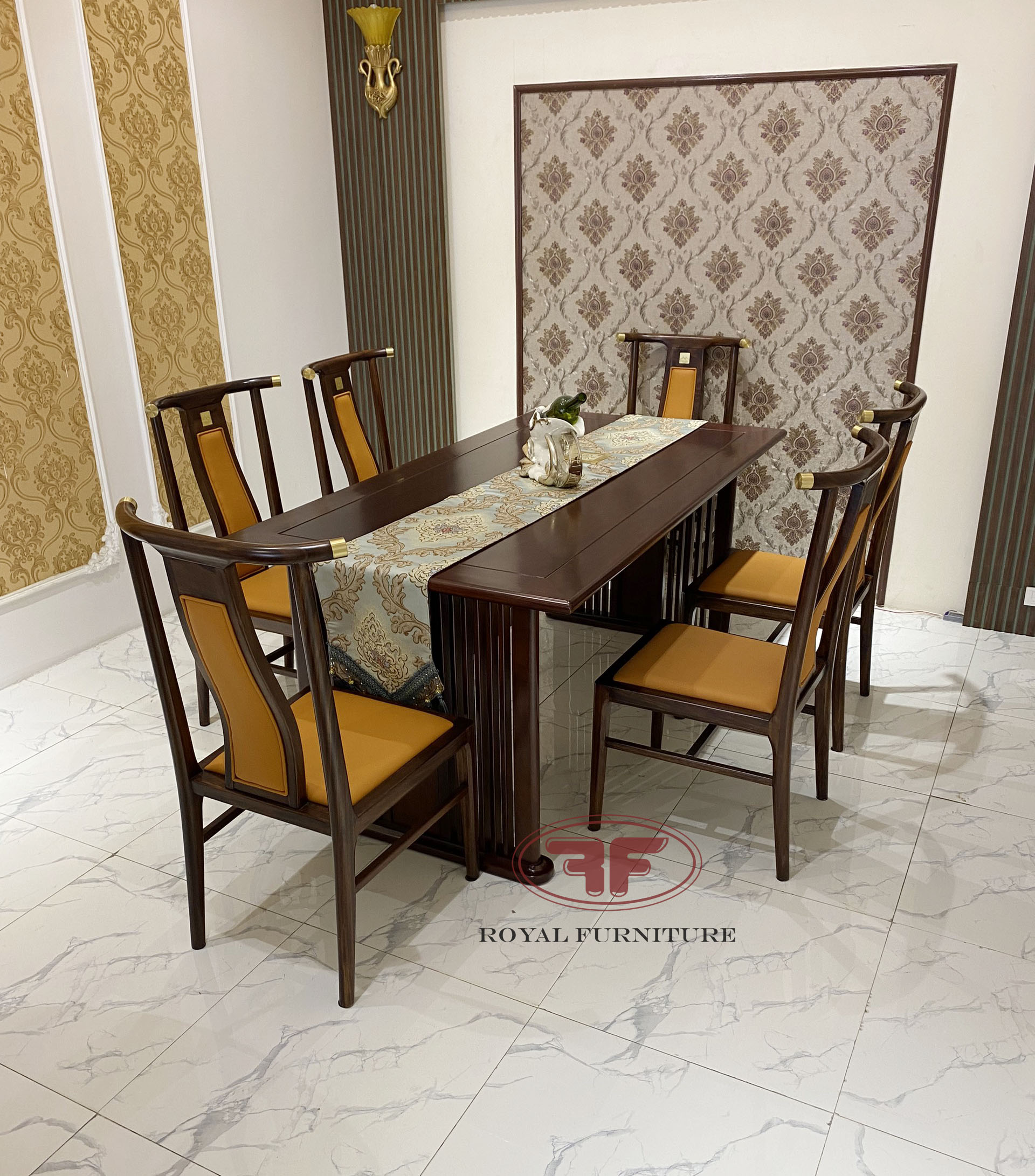 Ảnh chụp thực tế tại showroom mẫu bàn ăn chữ nhật 6 ghế Indochine Gỗ óc chó bọc da cam sang trọng A01