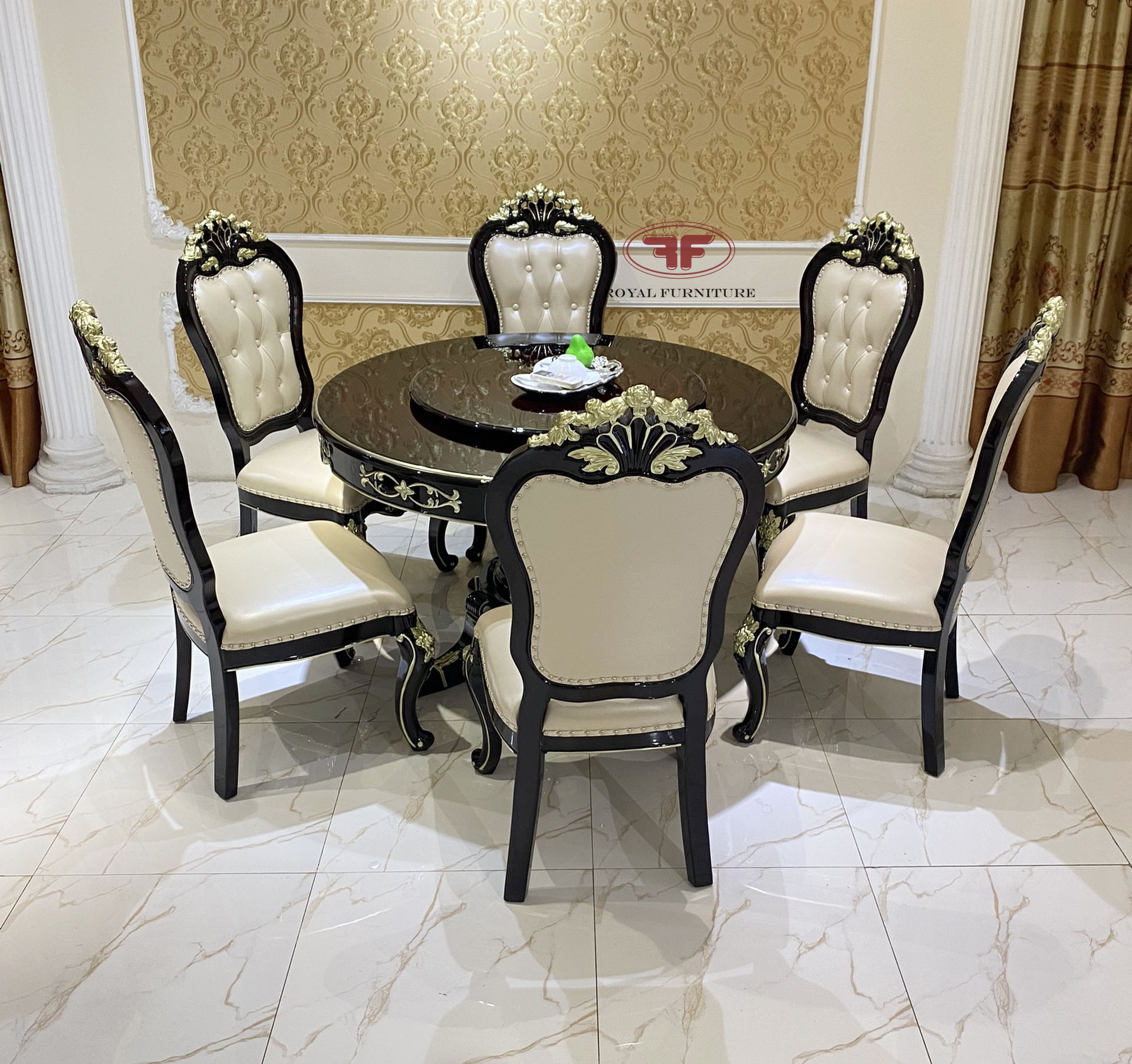 Bộ bàn ăn tròn mặt gỗ mâm xoay kết hợp 6 ghế tân cổ điển G952