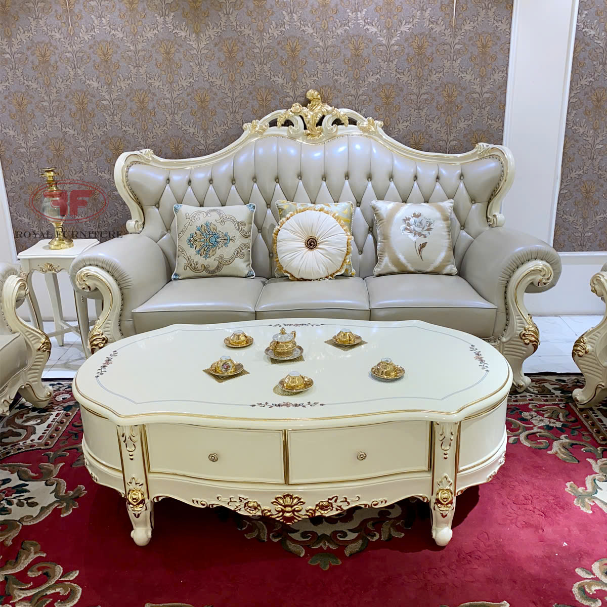 Điểm đặc biết không chỉ ở các chi tiết dát vàng sang quý và anh Tâm đã lựa chọn mẫu bàn trà 1m4 dát vàng mặt đá tự nhiên để nâng tầm giá trị của bộ sofa phòng khách tân cổ điển đủ để hoàn thiện một vẻ đẹp trọn vẹn cho không gian phòng khách tân cổ điển.
