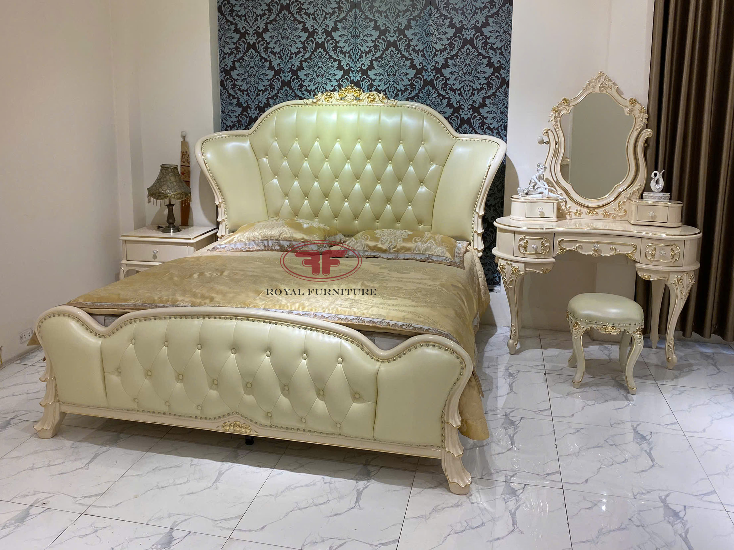 Bộ nội thất phòng ngủ 3 món tân cổ điển dát vàng cao cấp D502 đều nhưng những các sản phẩm khác trong nội thất tân cổ điển , vẫn sử dụng màu sơn kem bóng ánh ngọc trai đồng nhất màu sắc từ giường , táp và bàn trang điểm . Đặc sắc hơn là mẫu giường ngủ tân cổ điển D502 được thiết kế đầu giường bo cong nên nhìn sẽ thu hút , có chút điệu đà mà vẫn trường dáng tạo sự hoành tráng cho căn phòng .