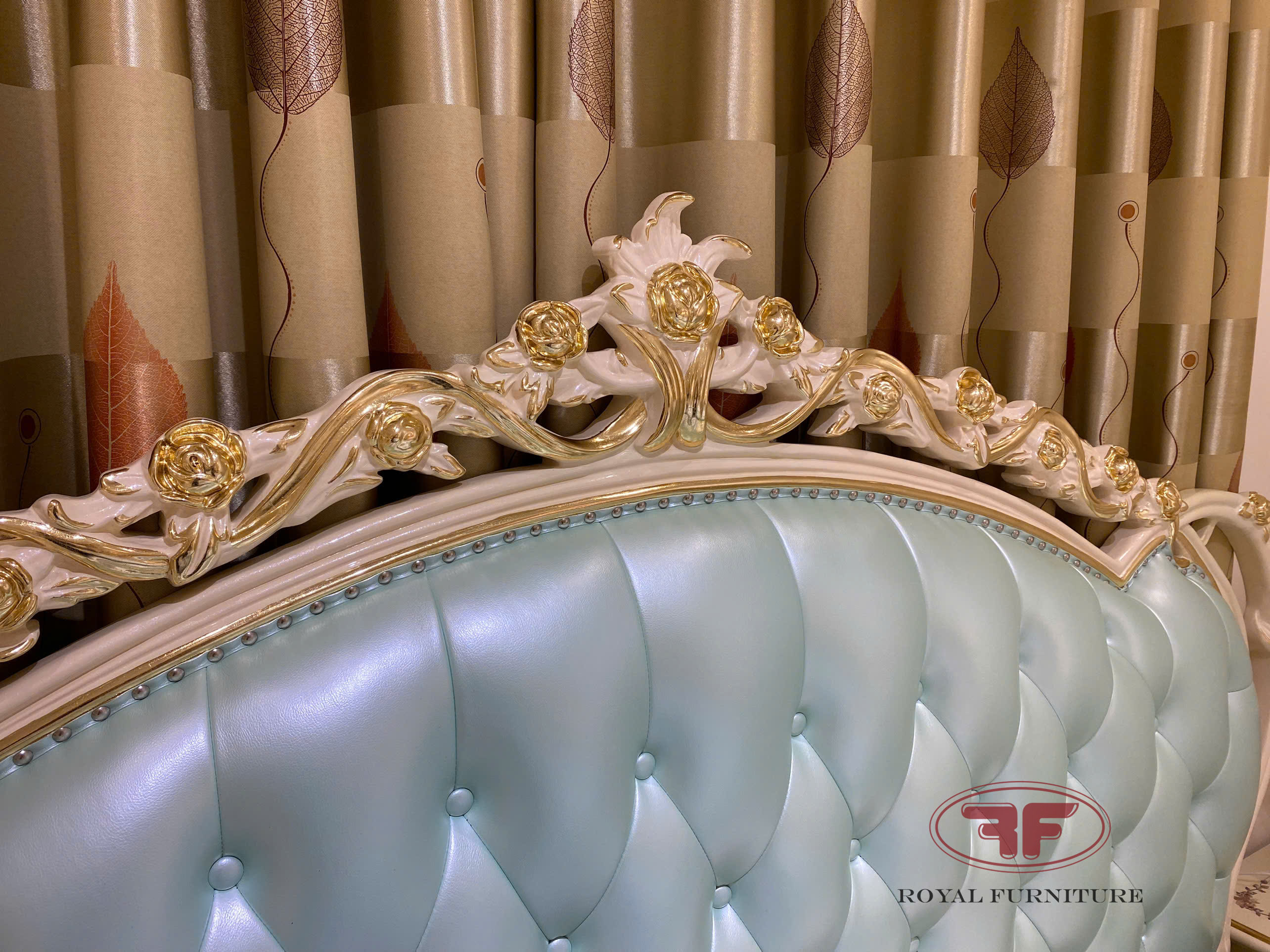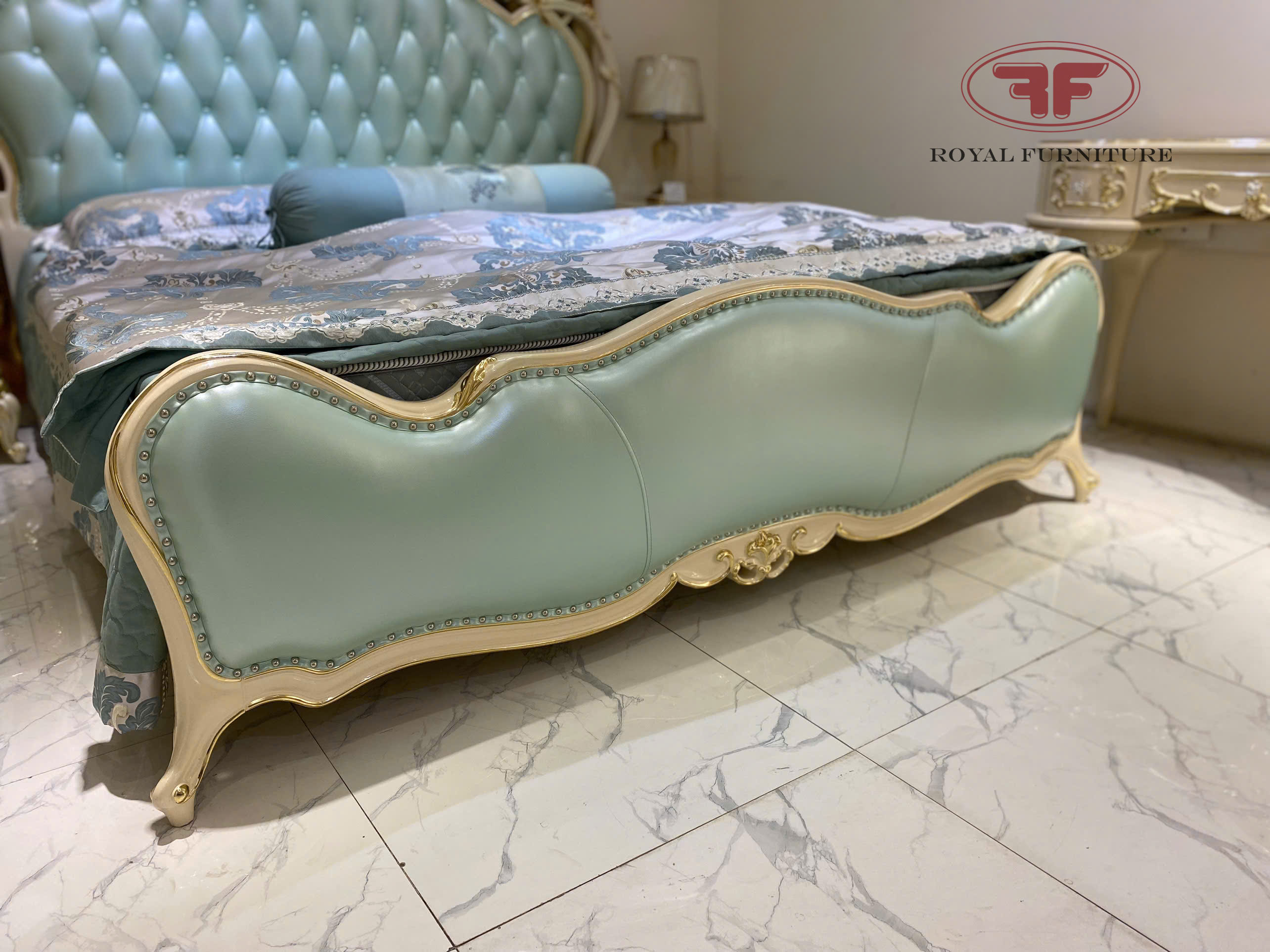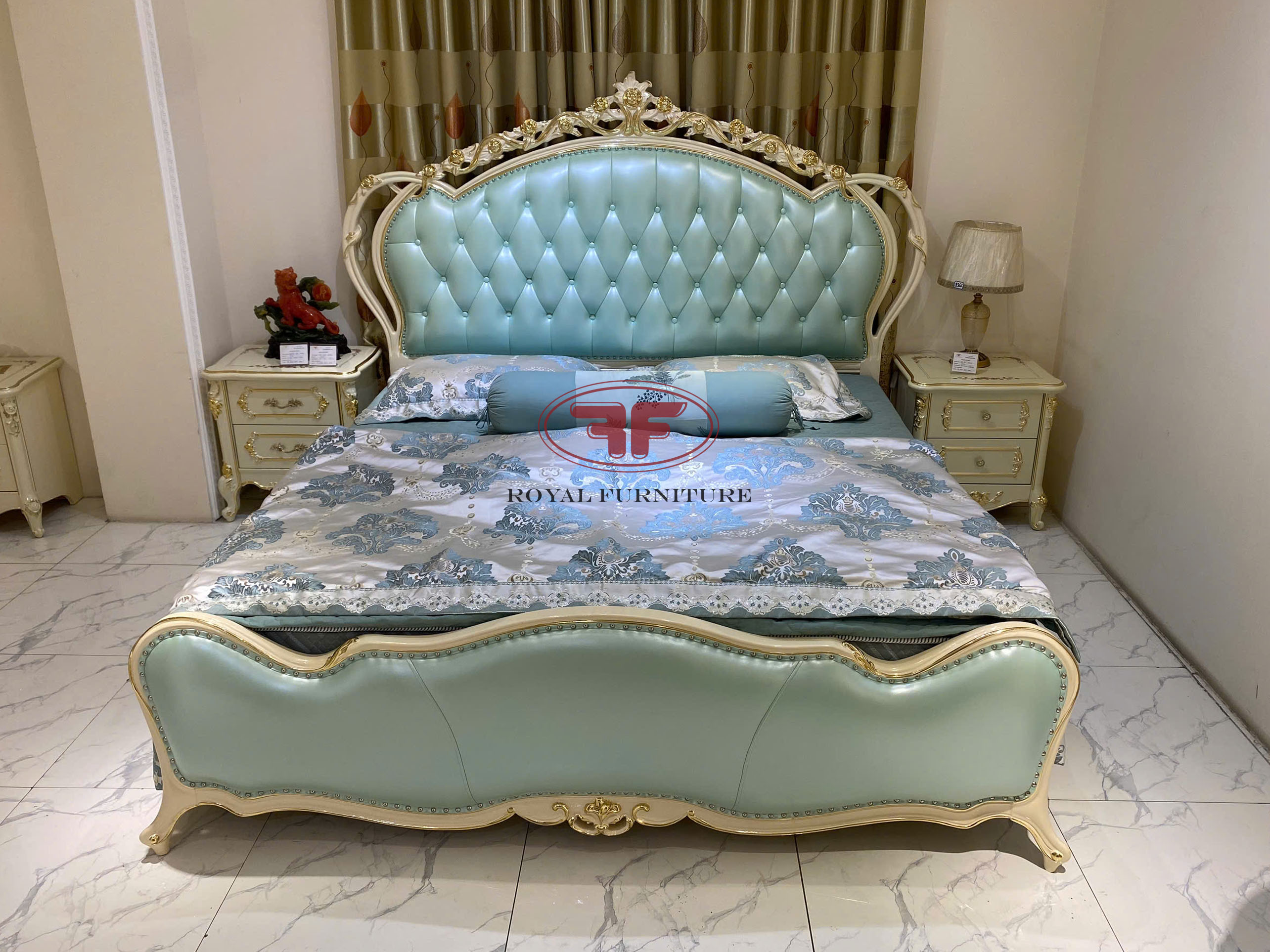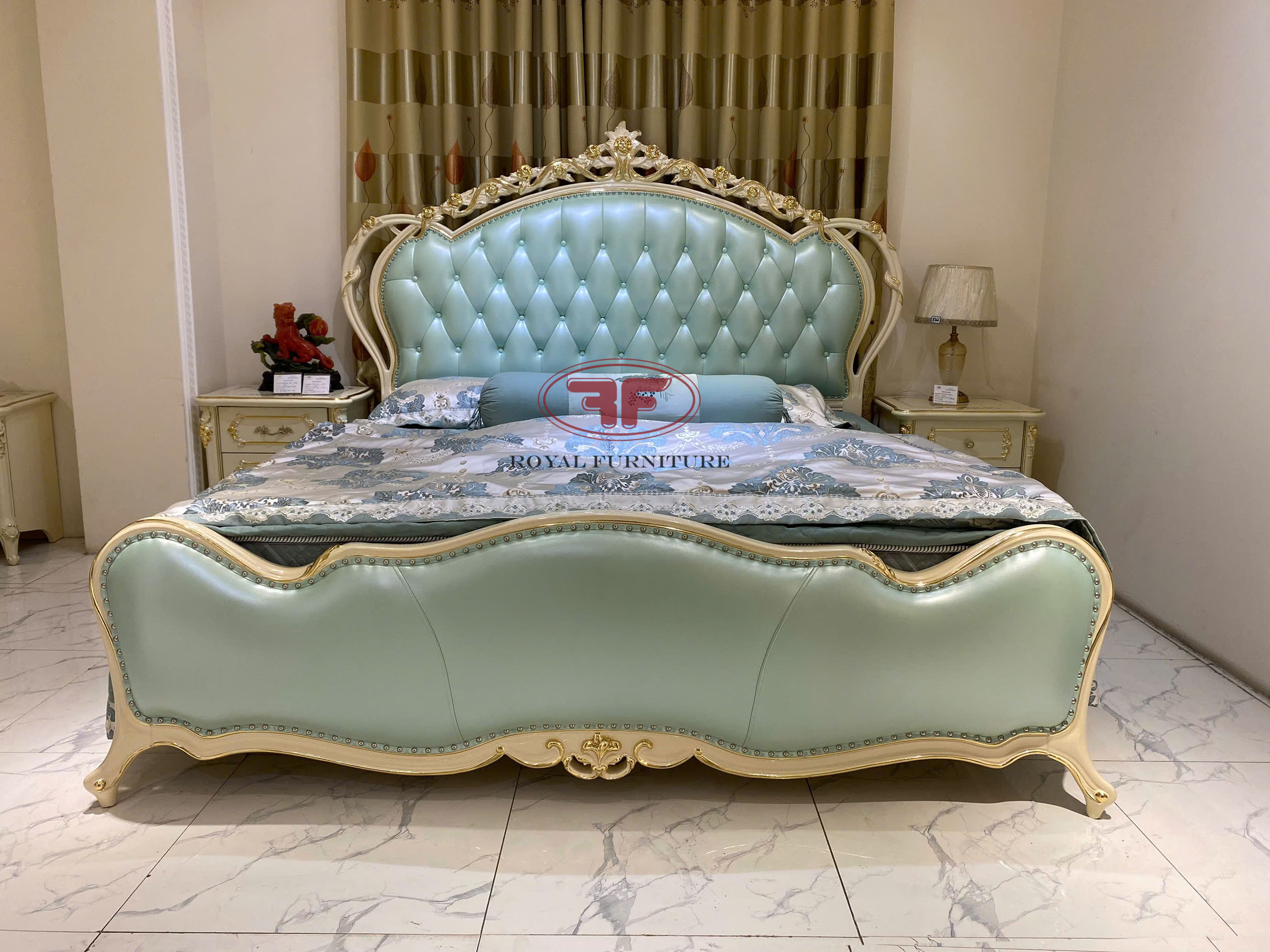 Giường ngủ tân cổ điển dát vàng nhập khẩu da xanh