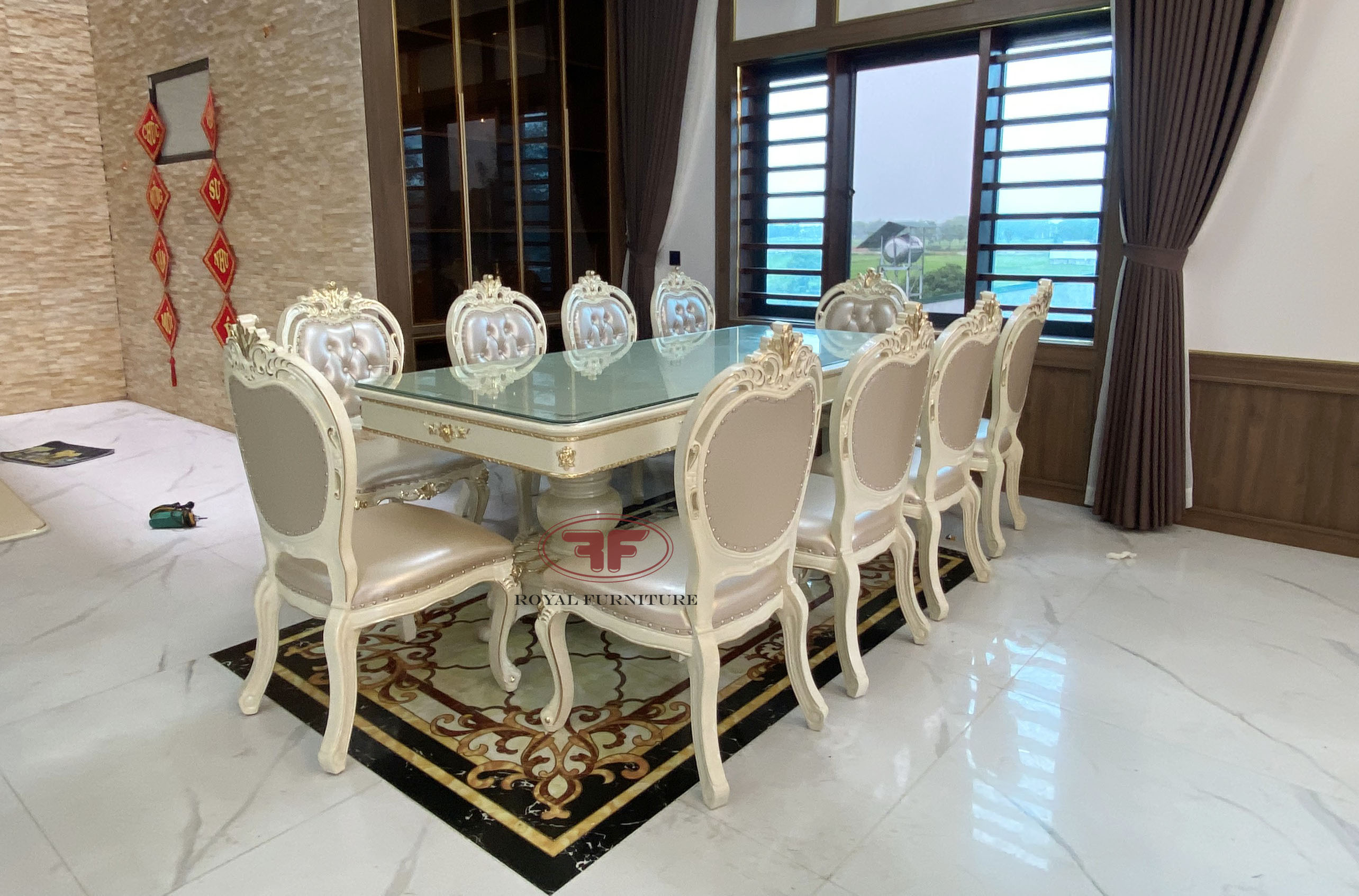 - Bàn ăn dát vàng 2m4 mặt gỗ + 10 ghế ăn ( 933B)