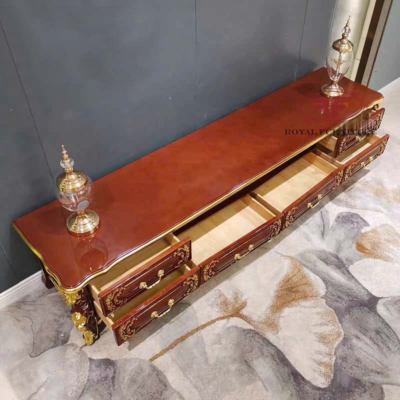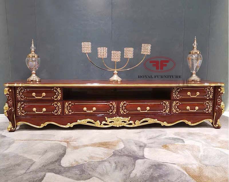 Kệ tivi tân cổ điển họa tiết dát vàng sơn nâu nho