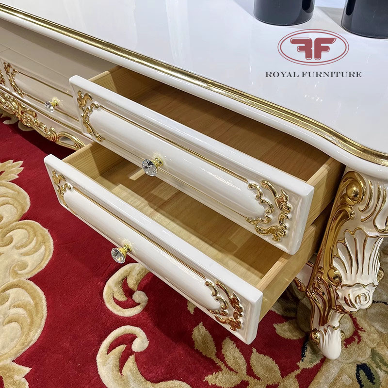 Nội thất Tân Hoàng Gia vừa lên mẫu kệ tivi dát vàng mặt gỗ, từng đường dát vàng quyền quý, sắc nét, nước sơn bóng ánh nhũ lấp lánh sẽ kiến tạo nên một không gian tiếp khách hoàng gia, đẳng cấp. Là mẫu nội thất tân cổ điển nhập khẩu 100%, kệ tivi phòng khách tân cổ điển sở hữu lớp sơn bóng ánh nhũ cực kỳ đặc trưng mà nội thất trong nước không có được. Kệ được tích hợp 6 ngăn kéo tăng không gian lưu trữ đồ dùng cho gia chủ, giúp phòng khách luôn luôn ngăn nắp, sẵn sàng đón tiếp khách ghé chơi.