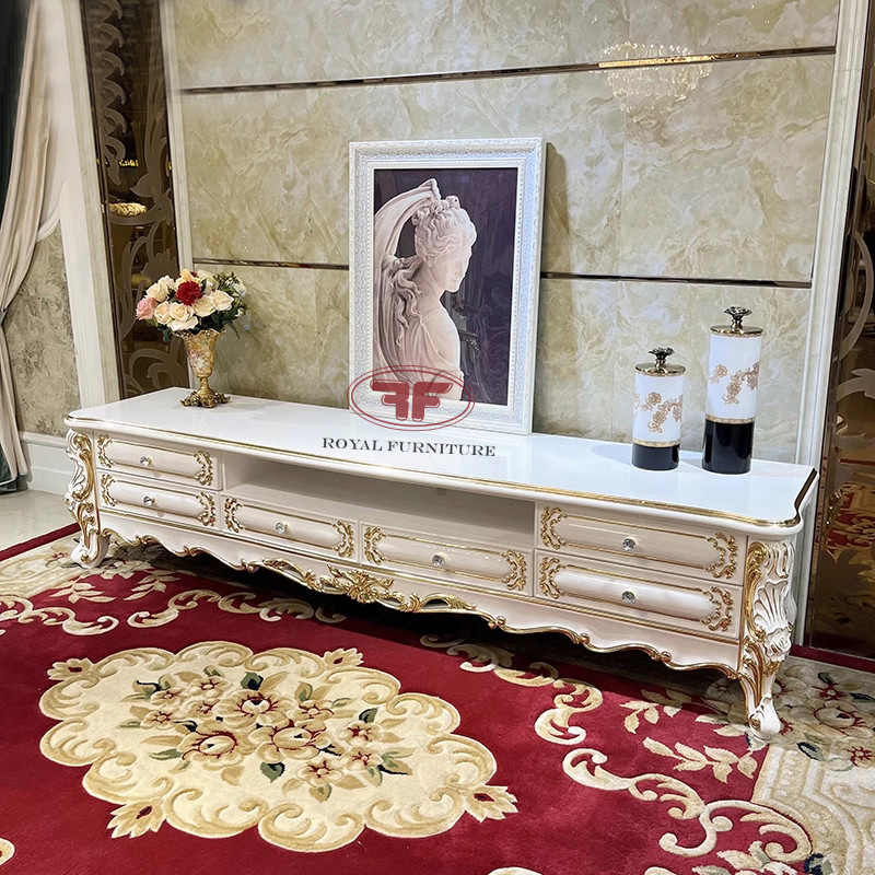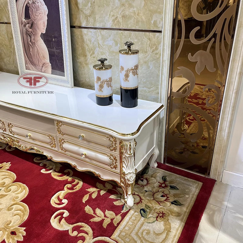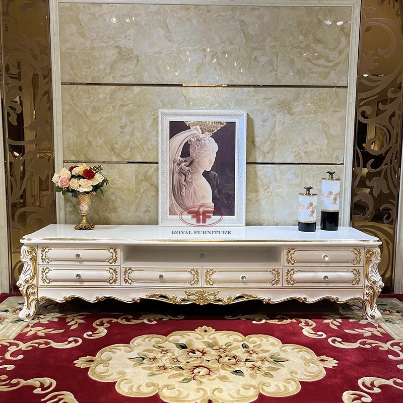 Kệ tivi phòng khách tân cổ điển dát vàng mặt gỗ