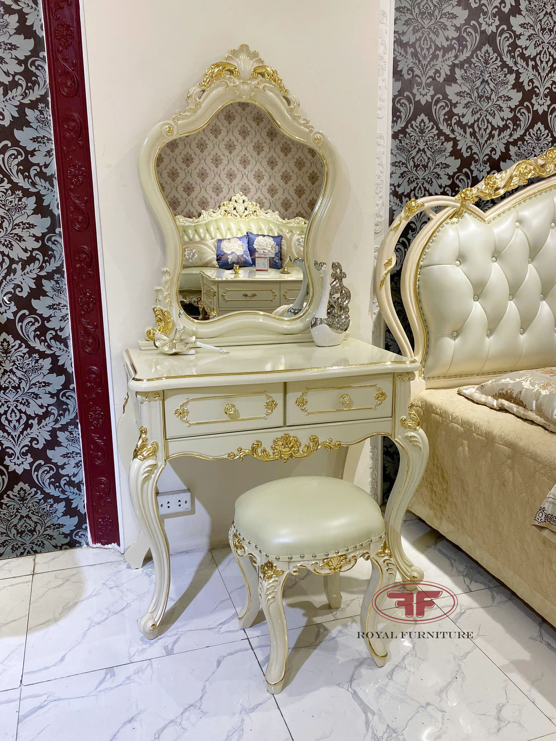 Góp mặt trong BST Nội thất dát vàng , set ngủ 3 món với các món cơ bản nhất cho phòng ngủ tân cổ điển : bàn phấn , giường và táp đầu giường đều complex về họa tiết , nước sơn cũng như đồng bộ về các chi tiết dát vàng tỉ mỉ , nổi bật .