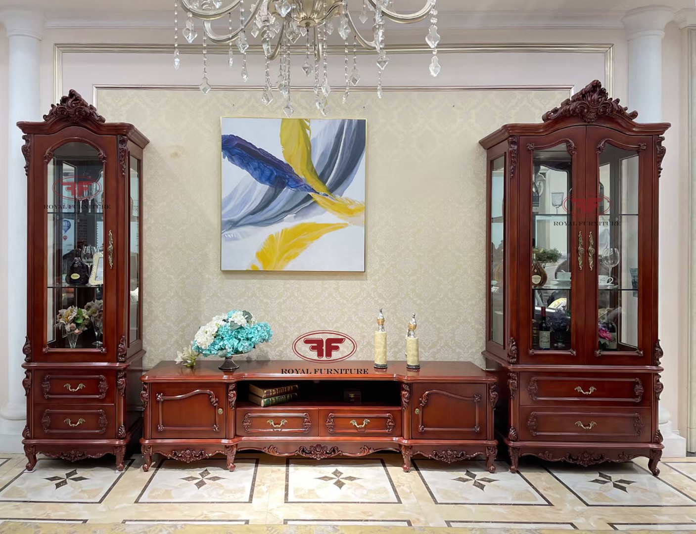 Bộ tủ rượu tân cổ điển kết hợp kệ gỗ gõ bao gồm 1 kệ tivi ở giữa, 1 bên là tủ đơn 1 cánh và 1 bên là tủ rượu đôi 2 cánh, 2 bên tủ rượu đều chia làm 3 tầng lắp kính sang trọng, tạo ra không gian phòng ăn tân cổ điển lý tưởng để gia chủ có thể trưng bày những món rượu quý, những chiếc ly đầy tinh xảo... Không những bề thế về kích thước, bộ tủ rượu tân cổ điển kết hợp kệ gỗ gõ còn quý giá về chết liệu và những đường nét hoa văn được gọt dũa tỉ mỉ.